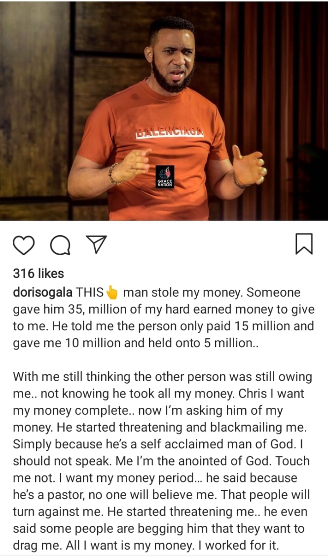 “He threatened and blackmailed me” – Doris Ogala calls out pastor Chris Okafor over alleged N25 million unpaid debt