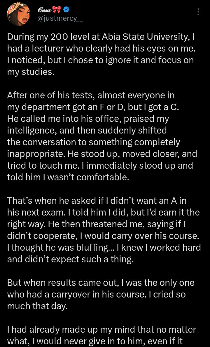 A former student of Abia State University has shared a disturbing account of alleged sexual harassment involving a lecturer during her 200 level.