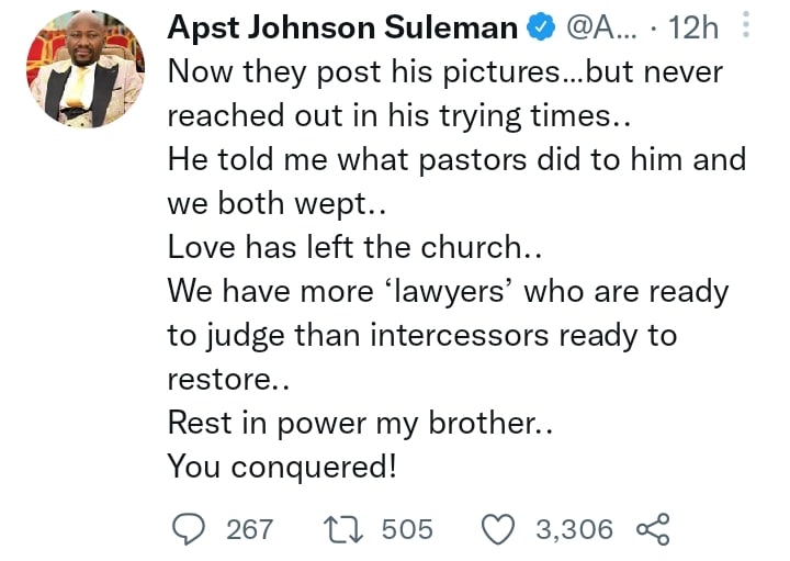 Apostle Suleman has said, after Sammie’s death, that love has left the church as there are many ‘lawyers’ eager to judge than intercessors who are ready to restore.