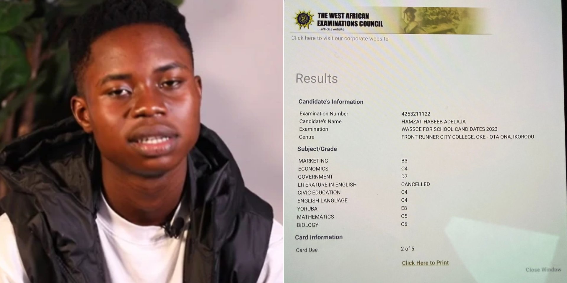 Peller shares his WAEC results