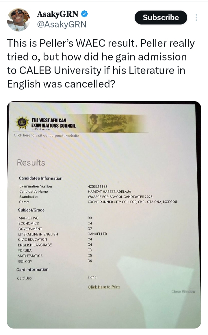 “This is Peller’s WAEC result. Peller really tried o, but how did he gain admission to CALEB University if his Literature in English was cancelled?”