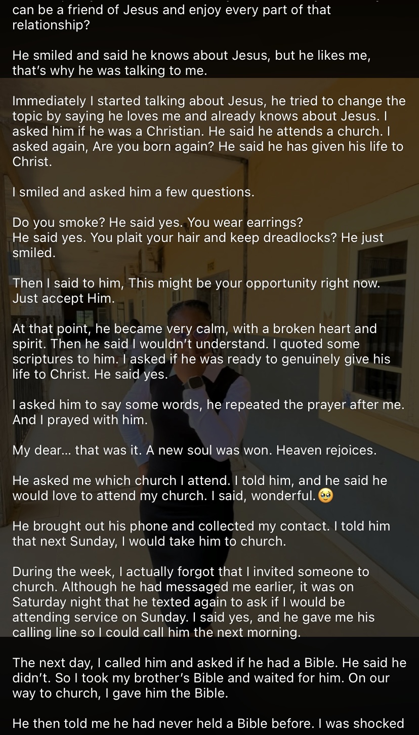 “At that point, he became very calm, with a broken heart and spirit. I asked if he was ready to genuinely give his life to Christ. He said yes. I asked him to say some words, he repeated the prayer after me. And I prayed with him. My dear… that was it. A new soul was won. Heaven rejoices.”