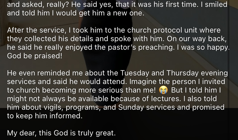 “He even reminded me about the Tuesday and Thursday evening services and said he would attend. Imagine the person I invited to church becoming more serious than me! 😭 But I told him I might not always be available because of lectures. I also told him about vigils, programs, and Sunday services and promised to keep him informed.