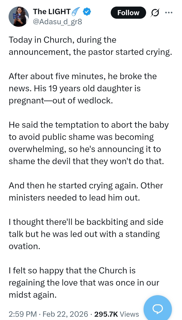 According to the post, during announcements, the pastor became visibly emotional and broke down in tears before revealing that his 19-year-old daughter is pregnant outside of marriage.