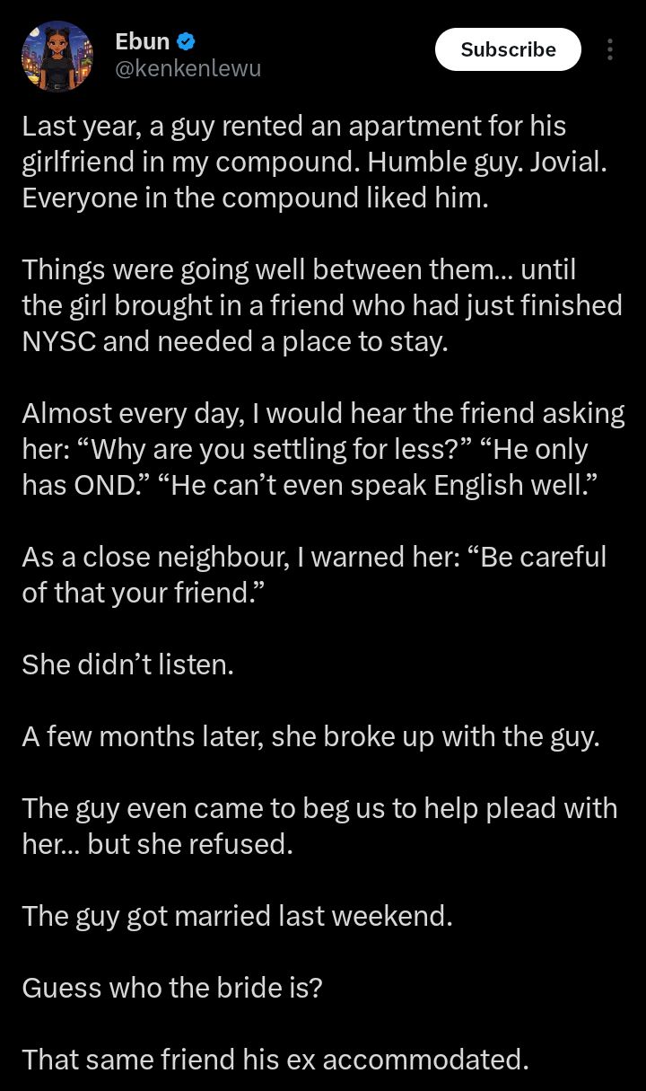 “He was ‘not good enough’ for her, now he is her friend’s husband” — lady shares how breakup took dramatic turn