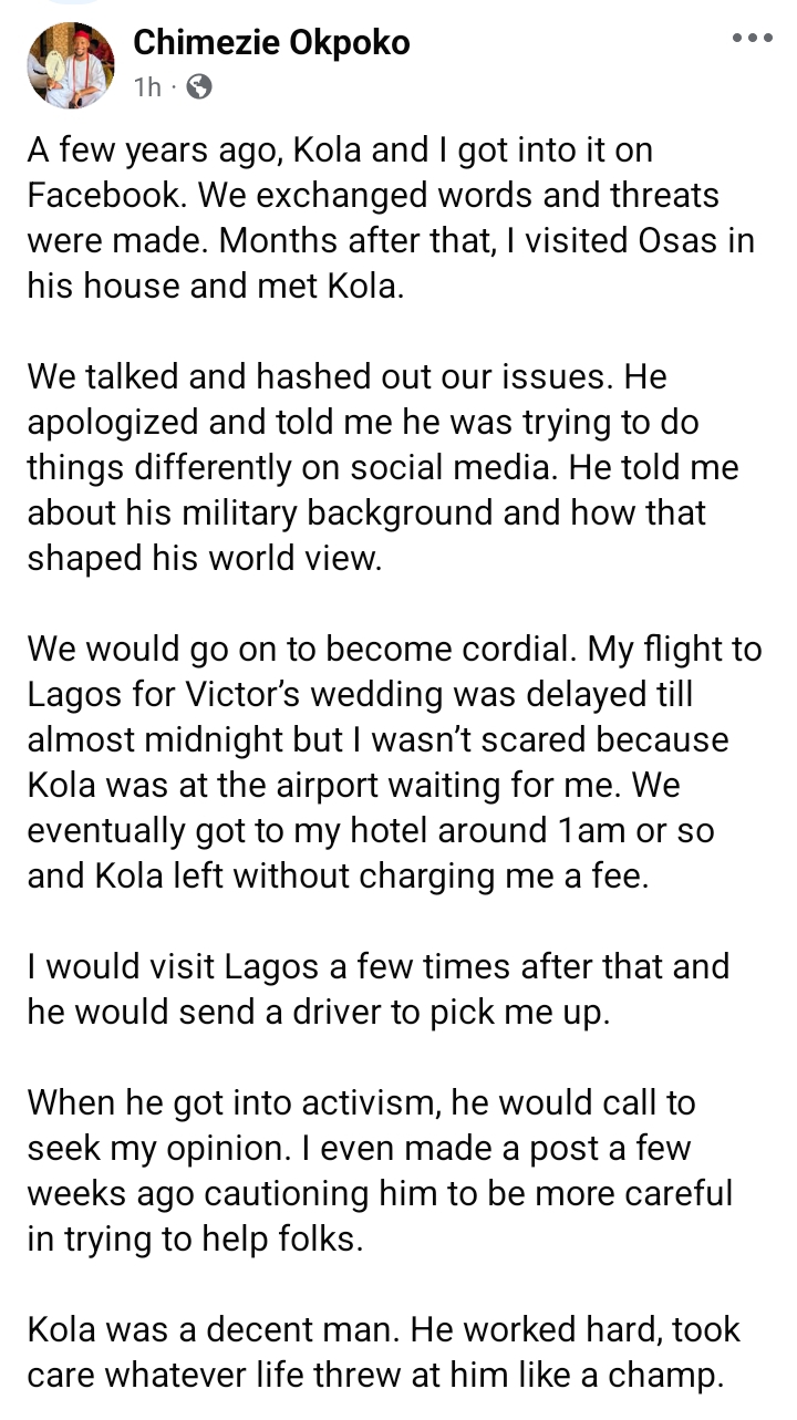 According to Okpoko, Kola apologized during that meeting and explained that he was trying to approach social media differently.