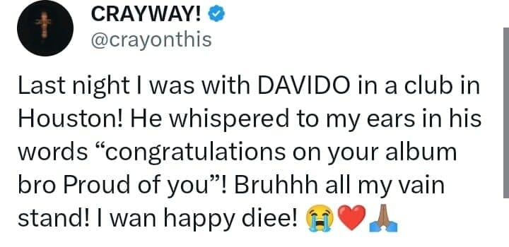 He wrote, “Last night I was with Davido in a club in Houston! He whispered to my ears in his words “Congratulations cc on your album bro Proud of you”. Bruhhh all my vain stand! I wan happy diee!!”.