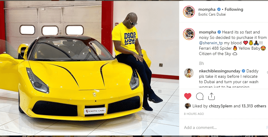 Mompha was spotted sitting on the yellow Ferrari while rocking a yellow t-shirt himself.