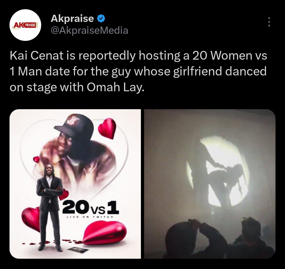 American online streamer and YouTuber, Kai Cenat, is reportedly hosting a ’20 Women vs 1 Man’ date for the guy whose girlfriend danced on stage with Omah Lay.