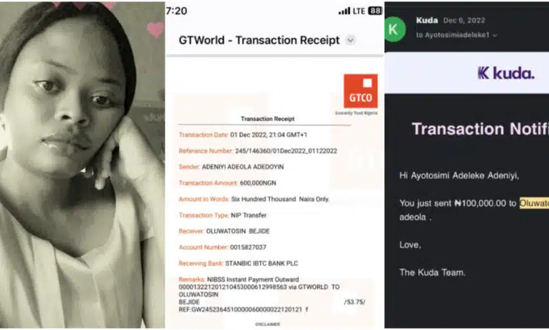 Princess Adeola alleges that she lent Oluwatosin Bejide N600,000 in multiple installments during the course of their relationship, after he approached her with claims of financial difficulty.