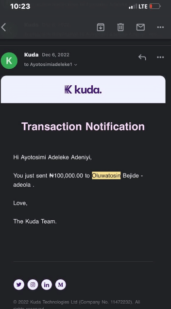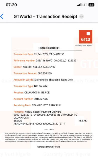 Following that, Bejide allegedly sought help again, claiming he was arrested by the police in Abuja. Adeola claims to have transferred an additional N100,000 to support his situation.