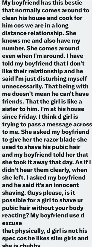 That the girl is like a sister to him. I’m at his house since Friday. I think d girl is trying to pass a message across to me. She asked my boyfriend to give her the razor blade she used to shave his pubic hair and my boyfriend told her that she took it away that day. As if I didn’t hear them clearly, when she left, I asked my boyfriend and he said it’s an innocent shaving.