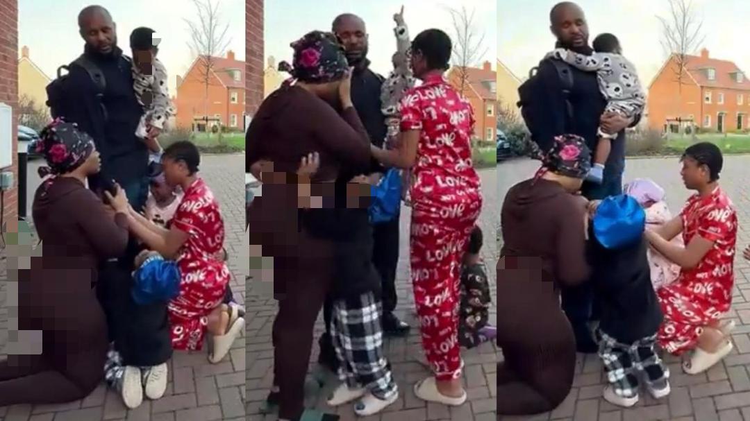 Heartwarming moment as abroad-based woman kneels with children to appreciate her hardworking husband
