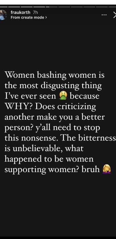 Korth who has seemingly waded into the conversation, stated that women bashing other women is the most disgusting thing she has ever seen. The mother of one who claimed that the “bitterness” is unbelievable, also wondered what happened to women supporting other women.