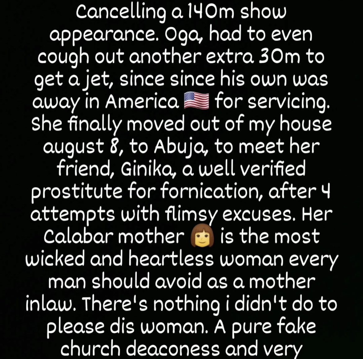 He wrote in one of his posts, “Her Calabar mother is the most wicked and heartless woman; every man should avoid her as a mother-in-law. There is nothing I didn’t do to please this woman; she’s a pure fake deaconess.”