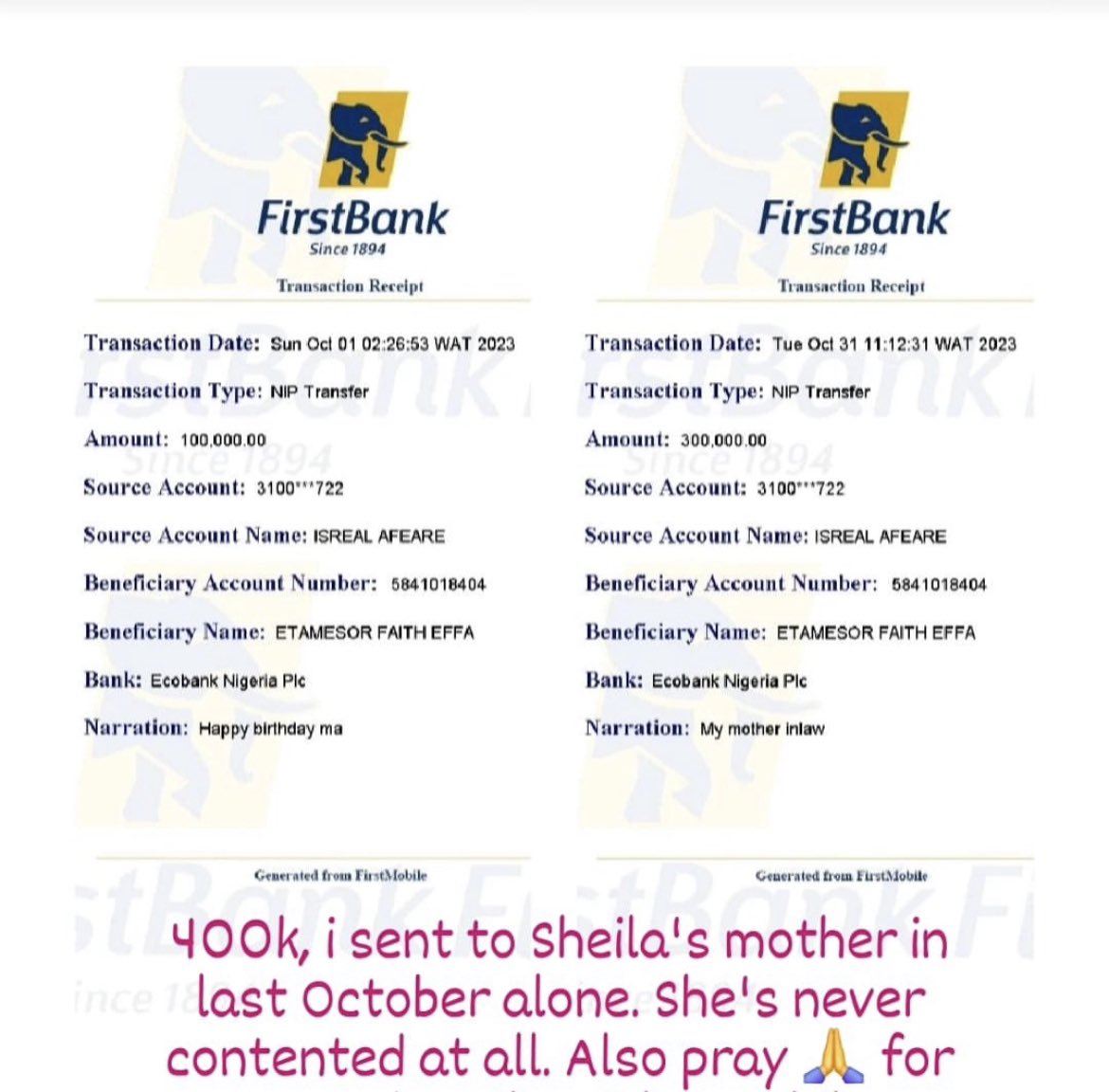 He went ahead to show an image detailing information about the money he sent to her account from his personal bank, First Bank.