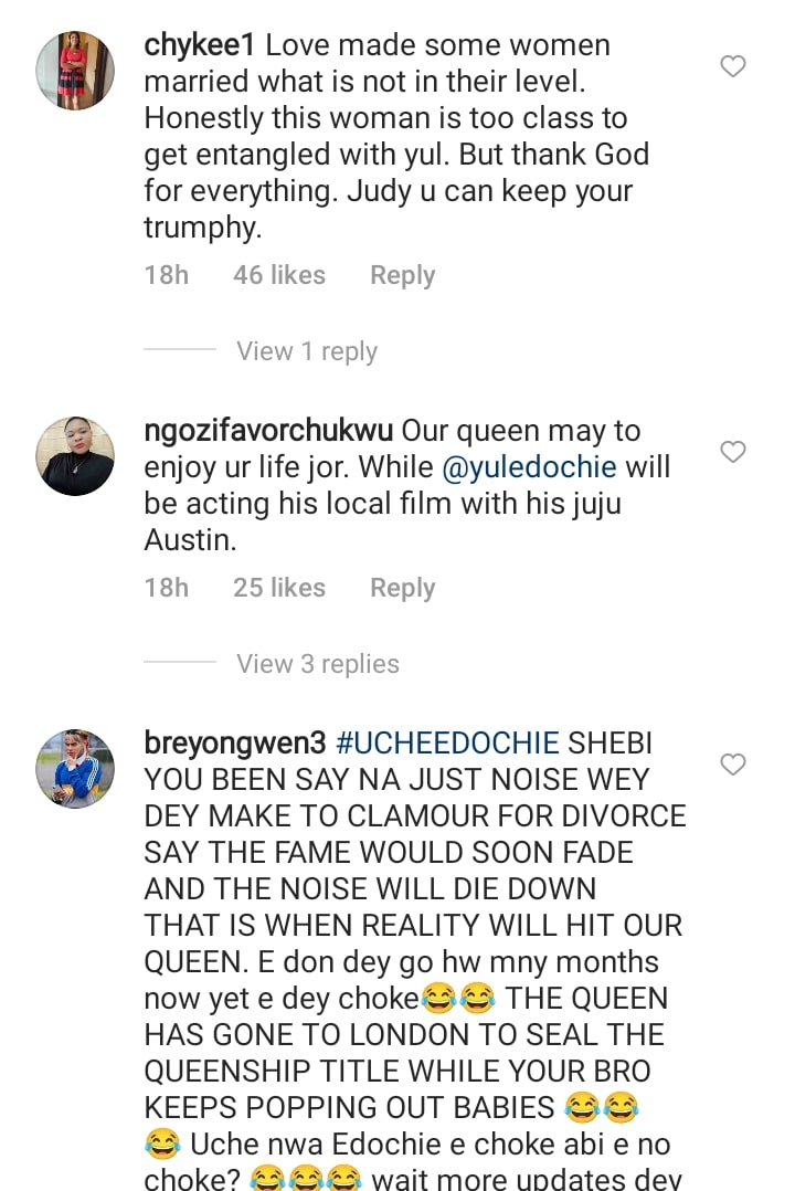 amy_peee wrote: “Yul d one corner the cry him a river….cus at this stage and time in his life he is supposed to be going round the world with his precious wife but cus of greed (Anya ukwu)and not knowing what he has, he lost it…”