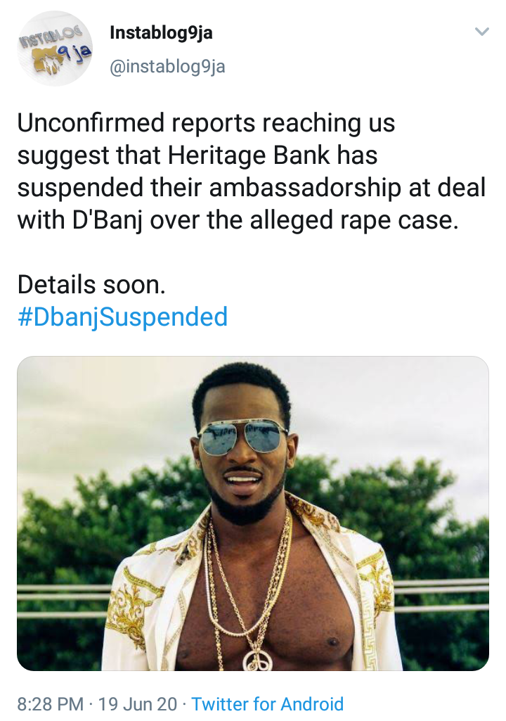 Nigerian finance institute, Heritage Bank has allegedly suspended their ambassadorial deal with singer, D’Banj over alleged rape case.
