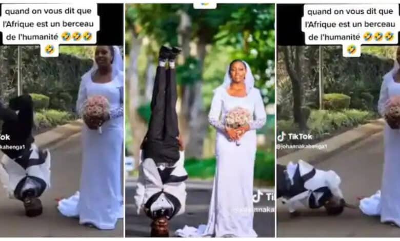 A video of a beautiful bride and her groom has caused a stir on social media as the man tries to stand on his head for a photoshoot.