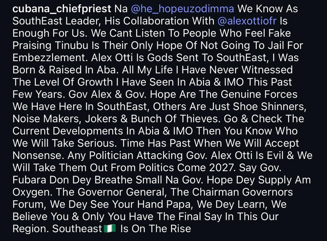 Popular socialite and businessman, Cubana Chief Priest, has openly declared Hope Uzodimma as the true leader of the South-East, while throwing his full support behind Abia State Governor, Alex Otti.