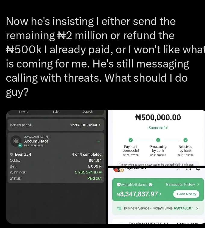 ”He demands at least another ₦2.5 million from my winnings, claiming I owe him more. He’s threatening to send cultists after me, saying he has my exact address and location and he actually showed proof that he knows it. I refused to send more, but I already gave him the initial ₦500k earlier“, The tweet reads in part.