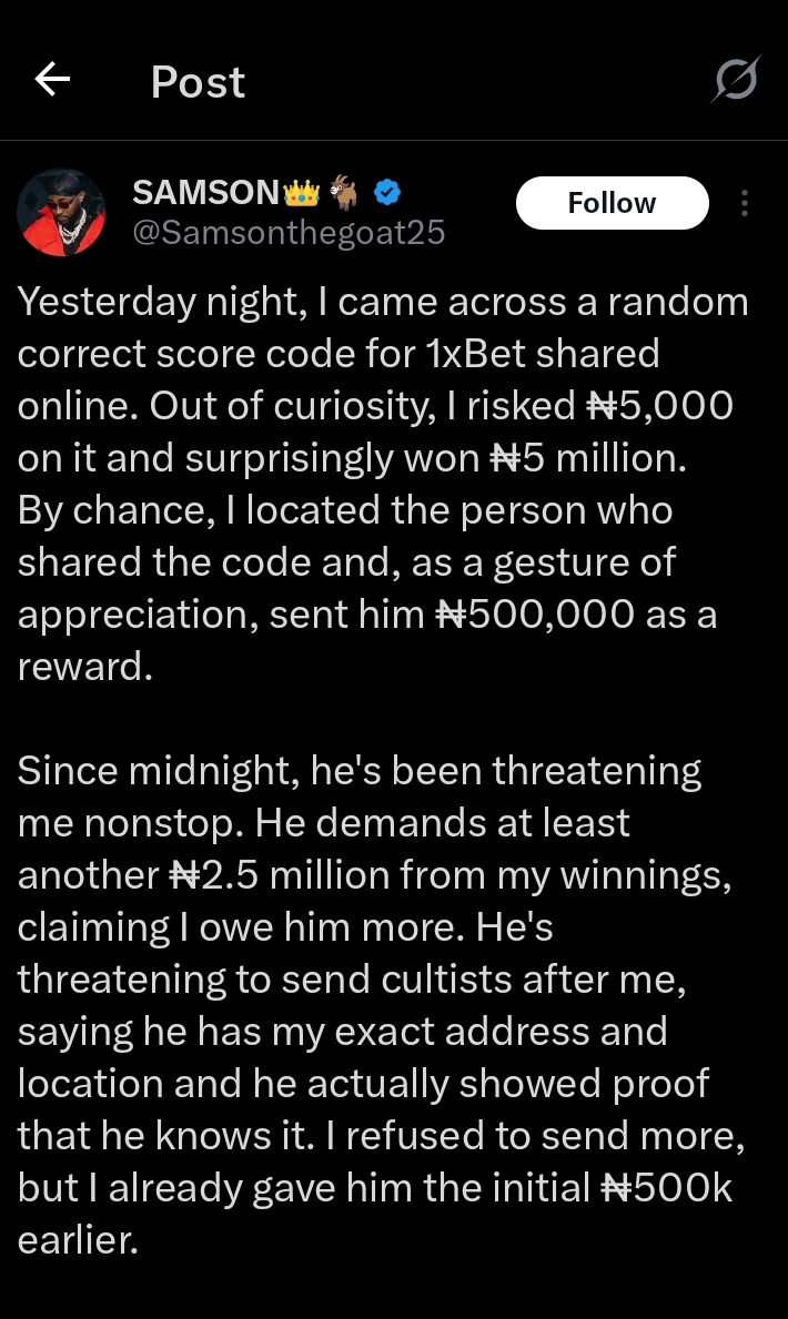 A user on the microblogging platform, X (formerly Twitter) who won ₦5 million from betting, cries out over threats received after victory.