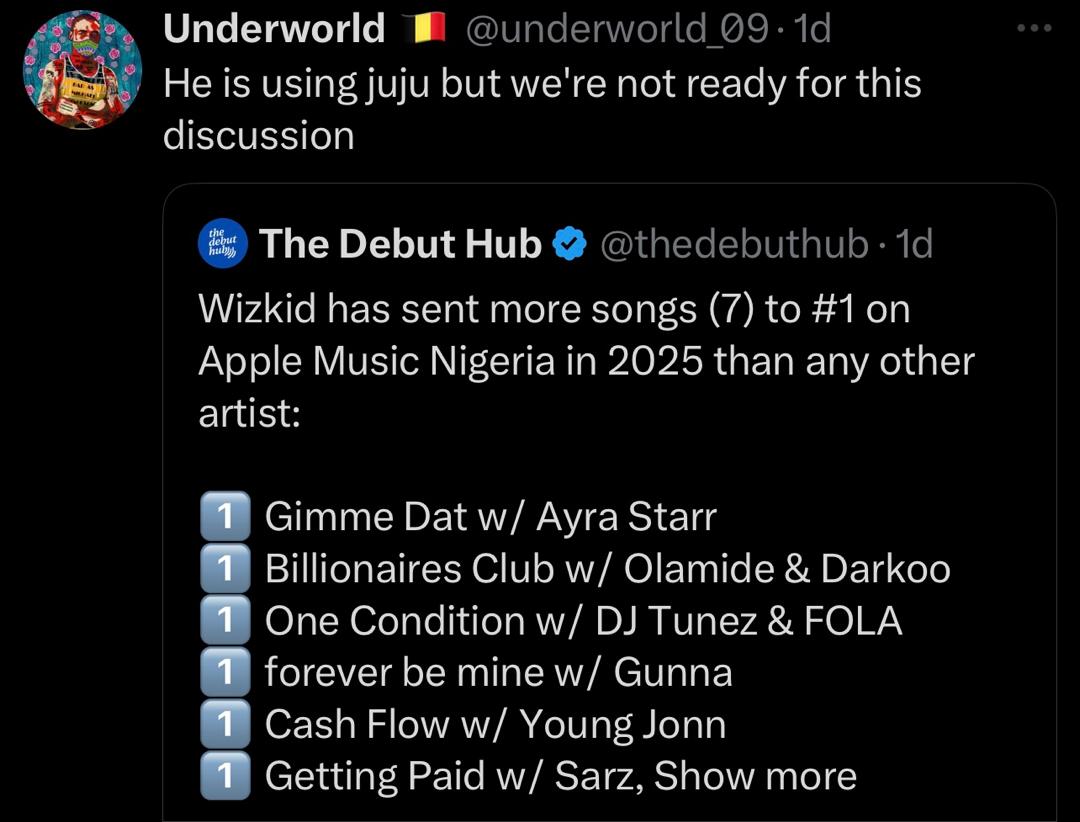 However, an X user recently stirred conversation online by suggesting that Wizkid might be using juju to achieve his success, sparking a mix of reactions from fans and followers.