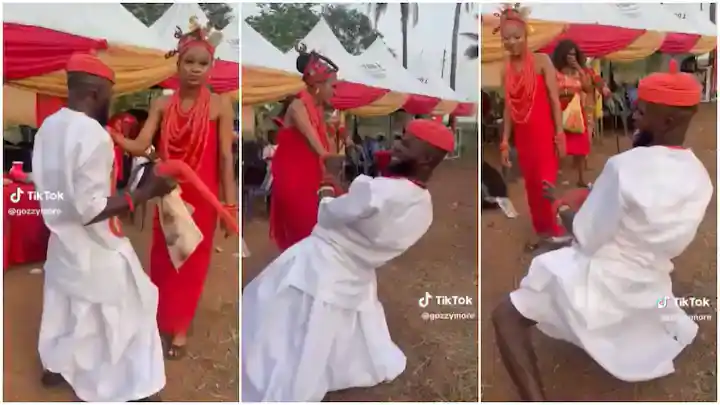A man (@gozzymore) has shared a video of a groom dancing with such gusto while his wife watched on in dismay during their traditional wedding ceremony