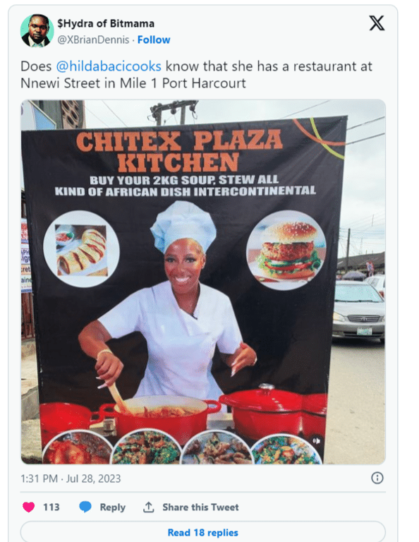 The restaurant, known as Chitex Restaurant Plaza, located at Nnewi Street in Mile 1, Port Harcourt, ingeniously utilized one of Hilda’s captivating kitchen photos on the banner, turning her into the face of their establishment.