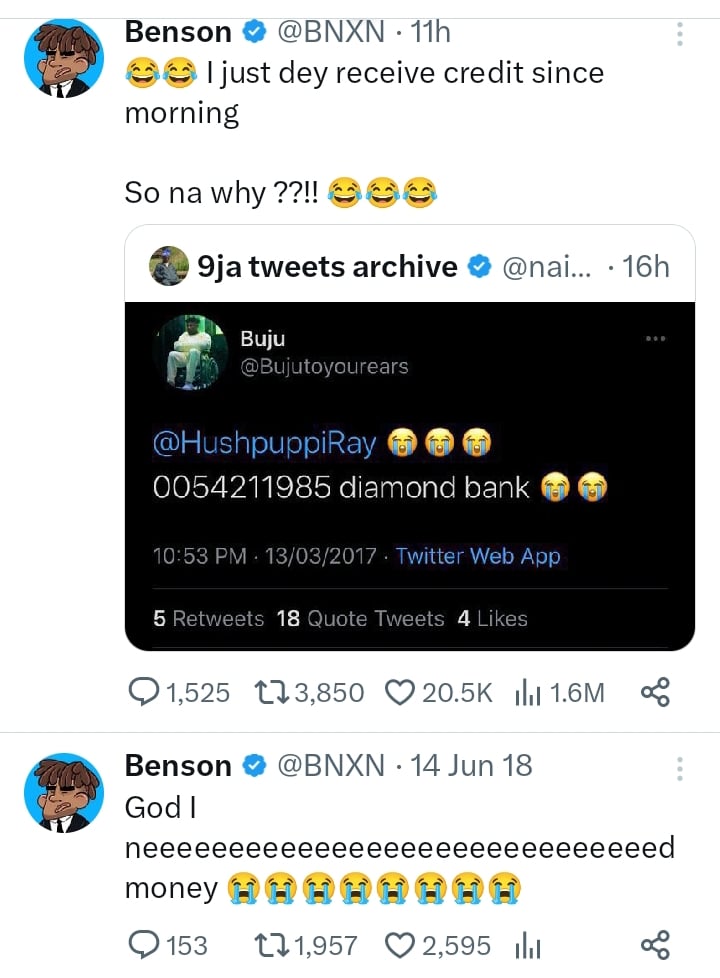 Netizens have expressed surprise as old tweets of popular singer, BNXN begging and crying out for money and N200 airtime are exposed.