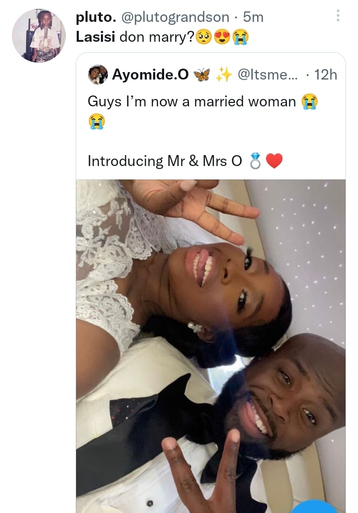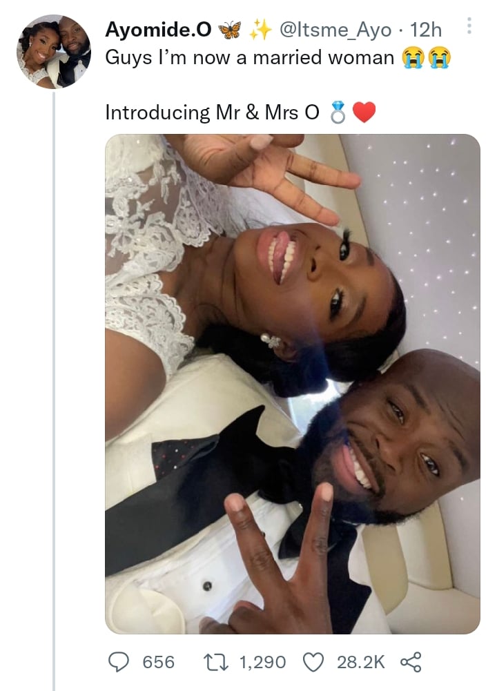 A Twitter user, @Itsme_Ayo, shared a picture of her and her husband which she took after her wedding, expressing her excitement over being a married woman.