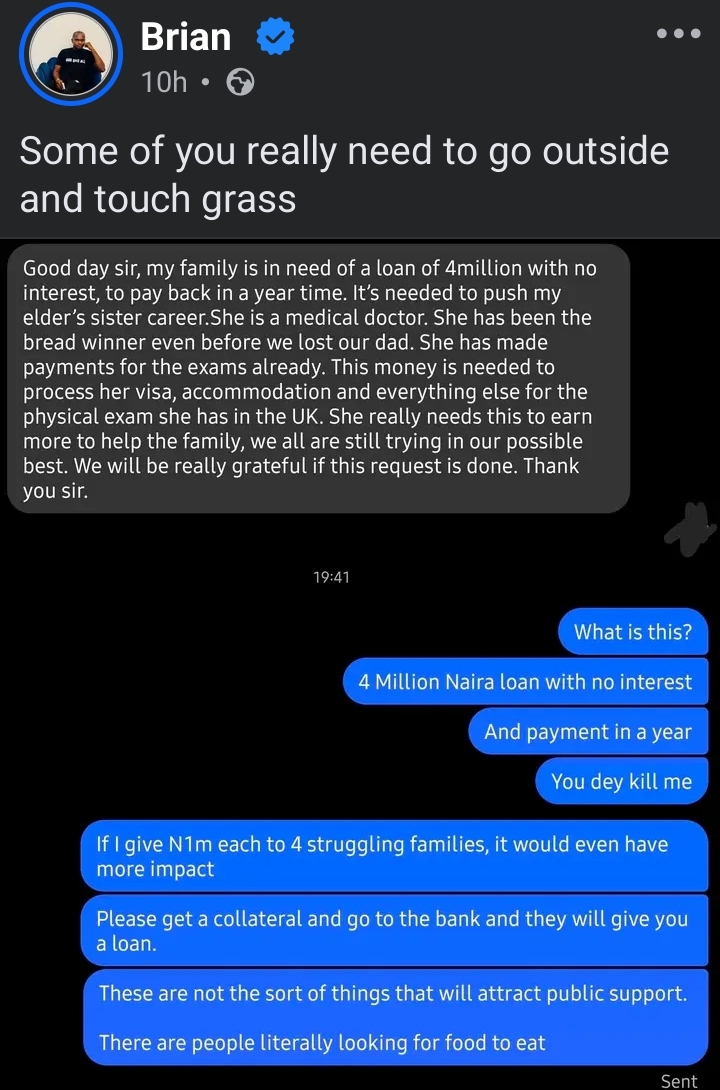 In the message sent to Brian, the sender appealed for financial help on behalf of their family, asking for a ₦4 million loan with no interest and a one-year repayment period.