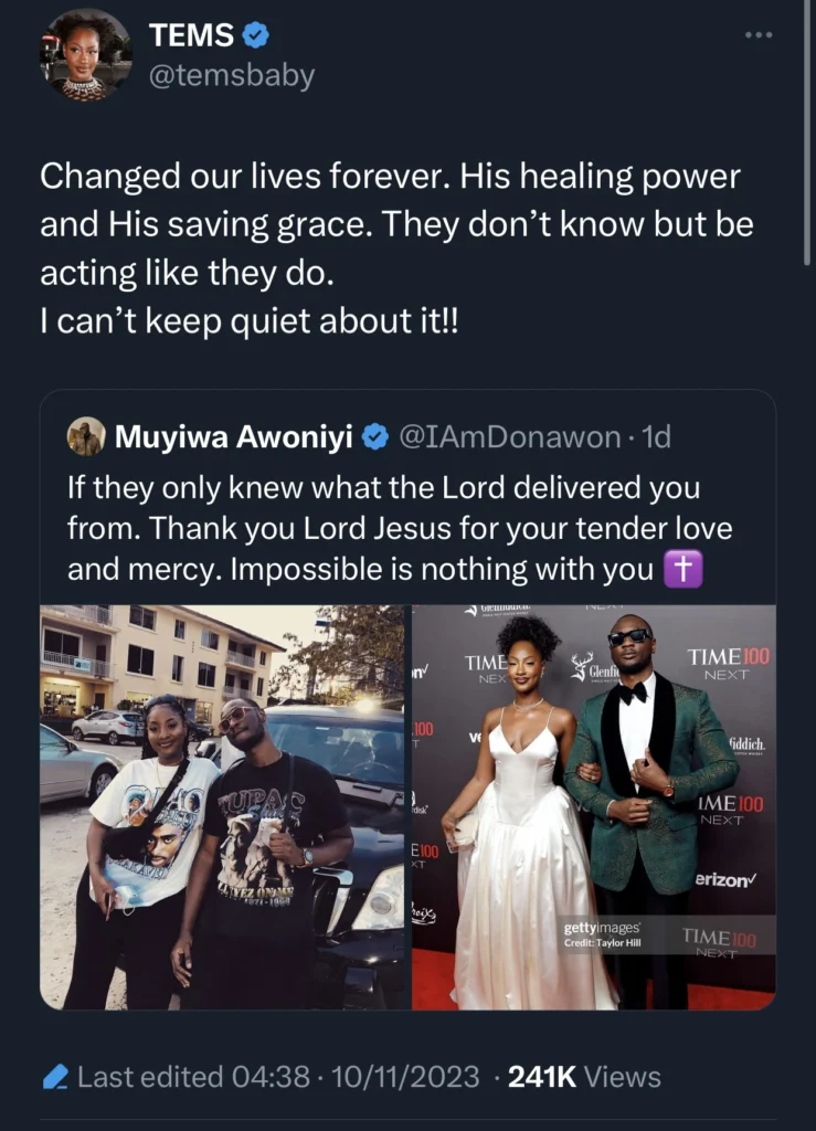 Her manager, Muyiwa Awoniyi, thanked God for his tender mercy as many people did not know what God delivered Tems from.