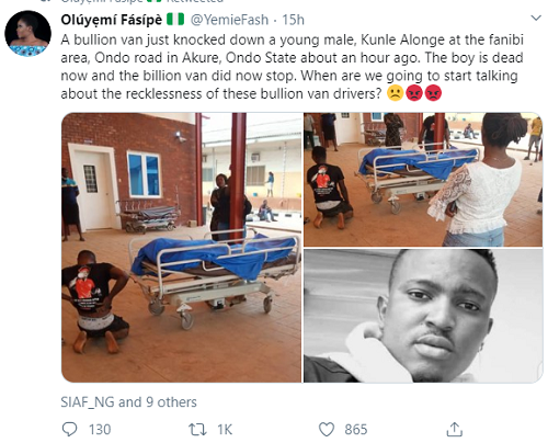 @YemieFash wrote; “A bullion van just knocked down a young male, Kunle Alonge at the fanibi area, Ondo road in Akure, Ondo State about an hour ago. The boy is dead now and the billion van did now stop. When are we going to start talking about the recklessness of these bullion van drivers?”