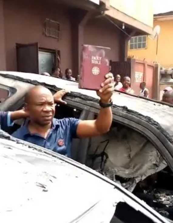 In a video showing the scenes of the inferno, the man who found the Holy Bible inside a completely razed vehicle; lifted it up and opened it while spectators stared wide-eyed in disbelief.