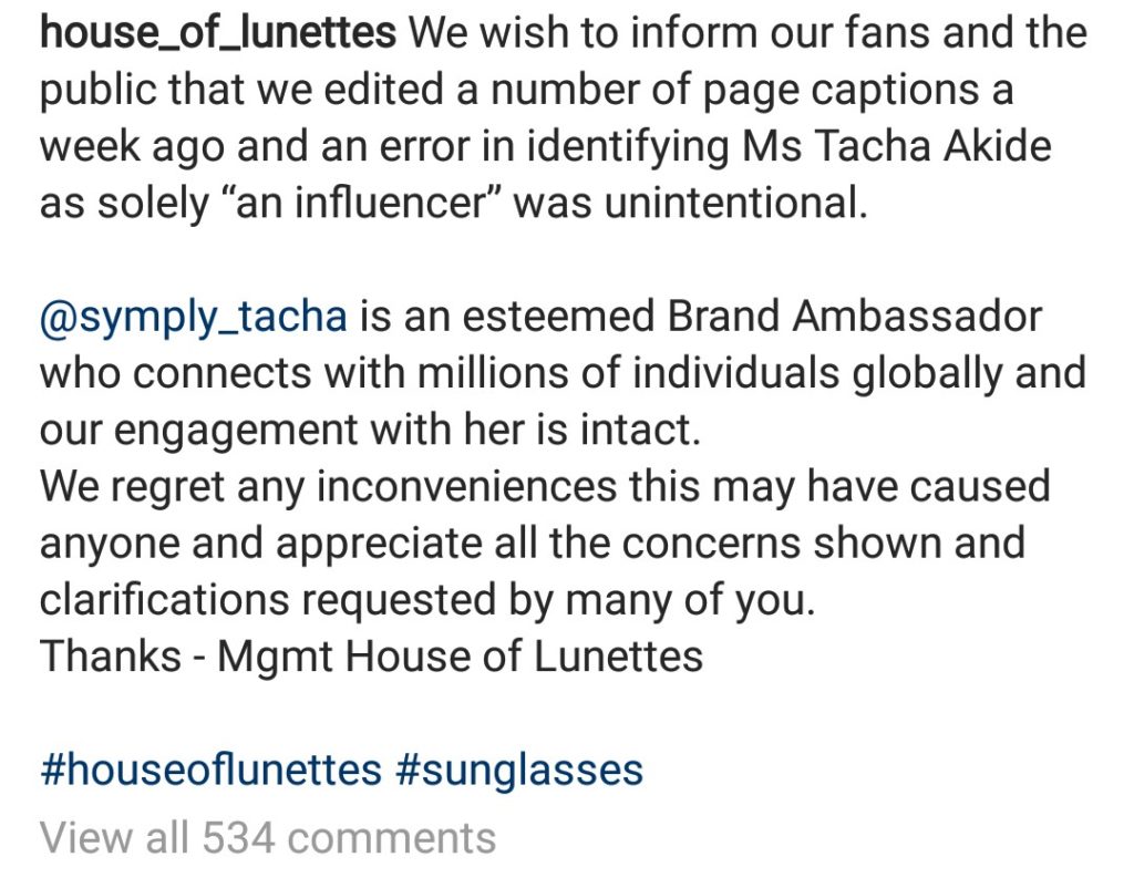 “We wish to inform our fans and the public that we edited a number of page captions a week ago and an error in identifying Ms Tacha Akide as solely “an influencer” was unintentional.