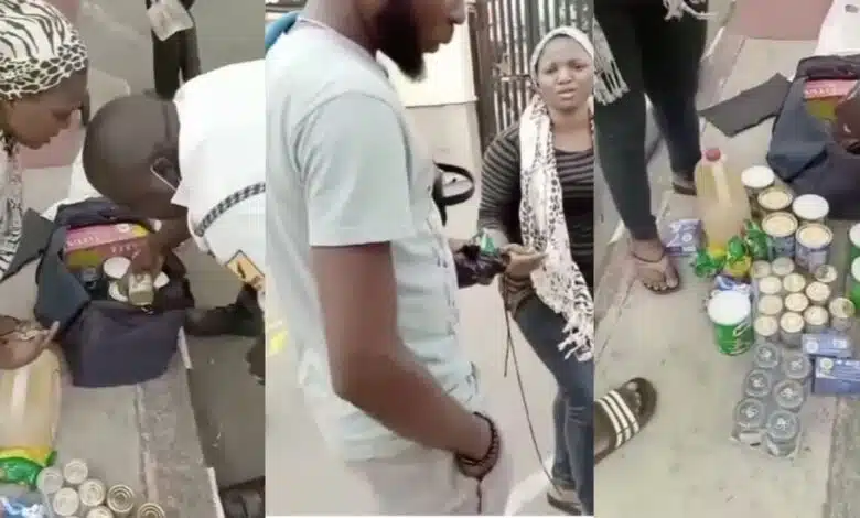 The man could be seen unpacking tins of milk, and chocolate amongst others which she was trying to make away with.