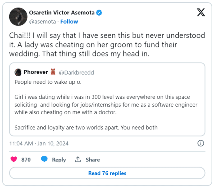 A Nigerian man Victor Asemota has shared a true-life story about a lady who went to extreme lengths to raise money for her wedding, resorting to cheating on her husband-to-be.