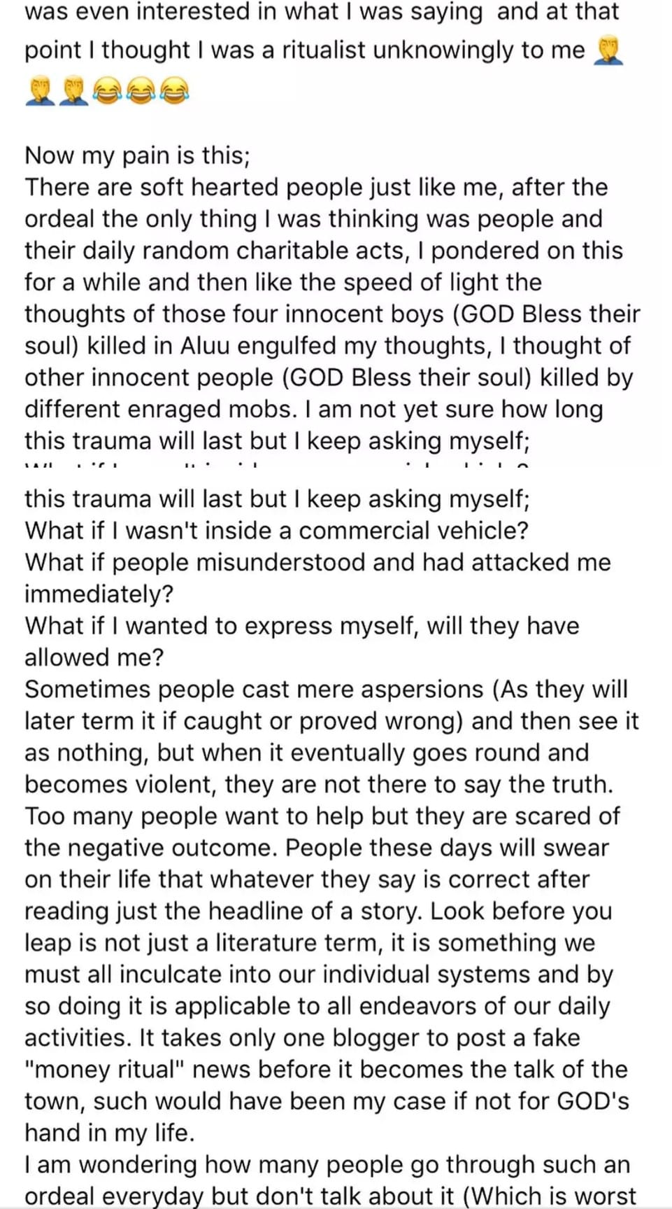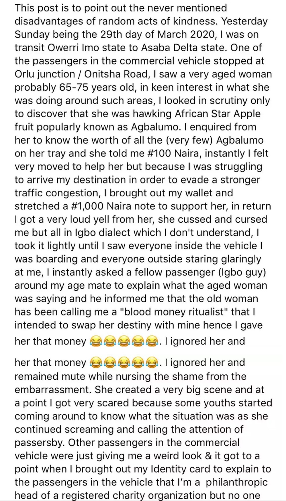 According to Okiemute, he gave the woman N1,000 after she said the remaining African Star Apple on her tray was worth N100. However instead of thanking him, the woman created a scene and called him a ritualist.