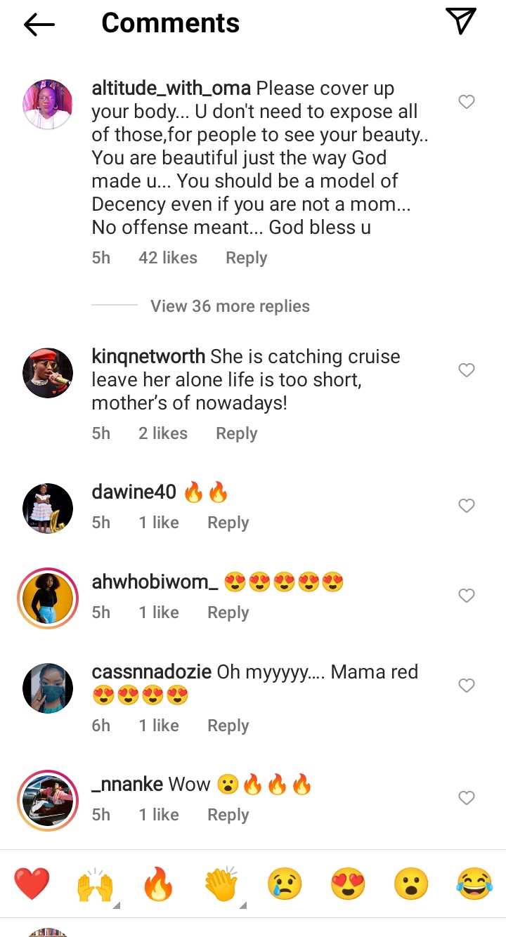 altitude_with_oma wrotr : “Please cover up your body… U don’t need to expose all of those, for people to see your beauty.. You are beautiful just the way God made u….. You should be a model of Decency even if you are not a mom….