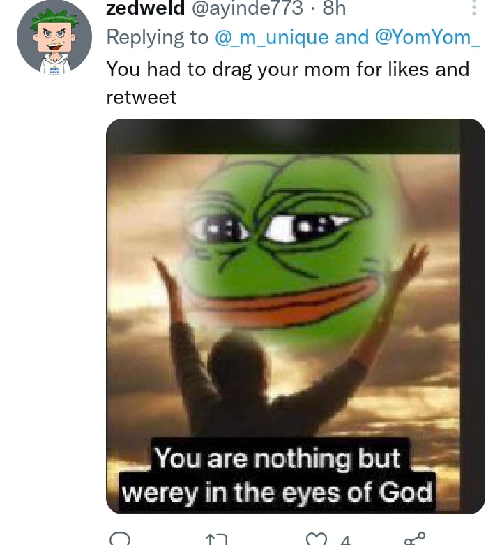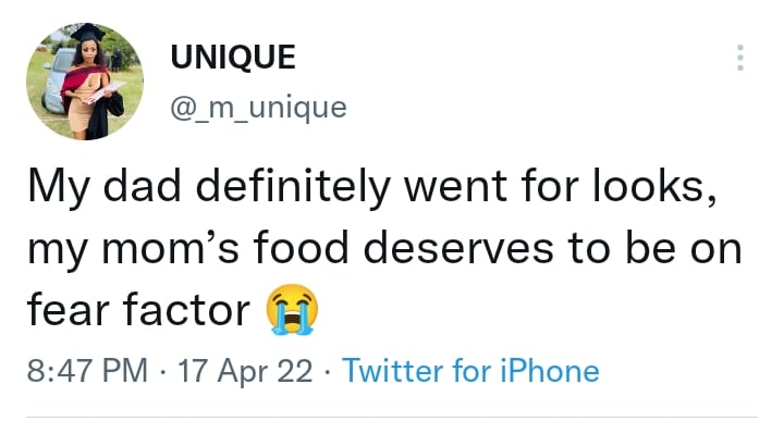 The lady identified with the Twitter handle @_unique_ describing how bad her mother’s cooking is, revealed that her father must have gone for her mother’s looks because her cooking is bad so it cant be the reason her married her.
