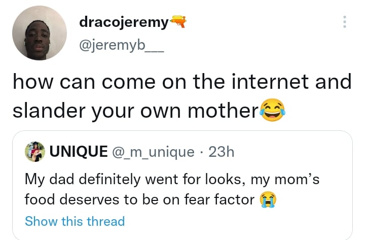 “My dad definitely went for looks, my mom’s food deserves to be on fear factor ?”