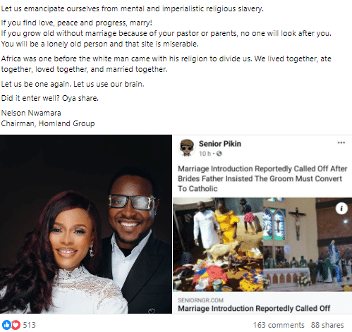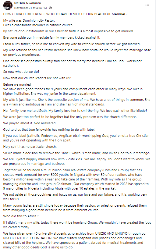A Nigerian man Nelson Nwamara hailing from Abia has opened up about the challenges he and his Imo heartthrob faced due to their church differences just three years ago.