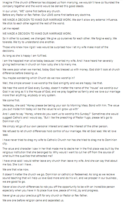 Highlighting their commitment to unity, “We are flexible with where we worship. We worship in both Catholic and Dominion City. Any church she wants us to go between these two churches, I go with her,” he added.