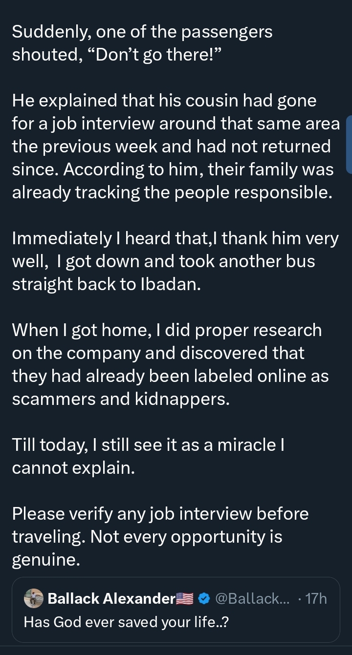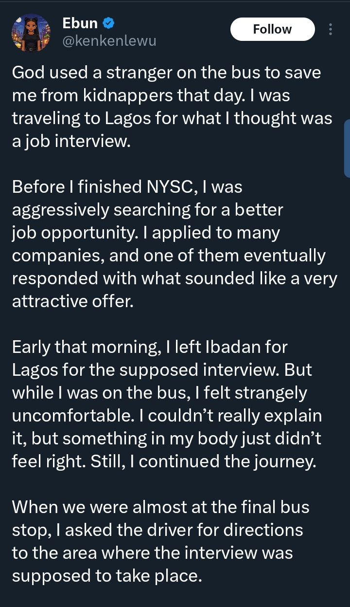 A Nigerian lady has recounted how a stranger’s warning on a bus allegedly saved her from falling into the hands of suspected kidnappers during a trip to Lagos for a supposed job interview.