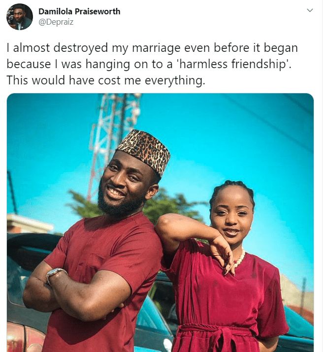 A Nigerian singer, Damilola Praiseworth, has narrated how he almost destroyed his marriage even before it began because he was hanging on to a ‘harmless friendship’.