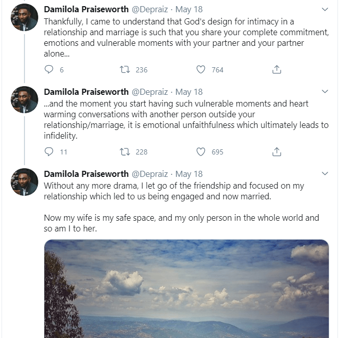 According to Damilola, he was still having vulnerable conversations with a female friend while having a committed relationship with his woman, but he later came to understand that God’s design for intimacy in a relationship and marriage is such that you share your complete commitment, emotions and vulnerable moments with your partner and your partner alone.
