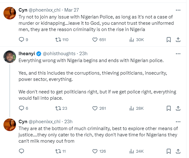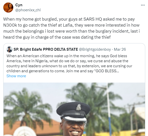 “When my home got burgled, your guys at SARS HQ asked me to pay N300k to go catch the thief at Lafia, they were more interested in how much the belongings i lost were worth than the burglary incident, last i heard the guy in charge of the case was dating the thief.