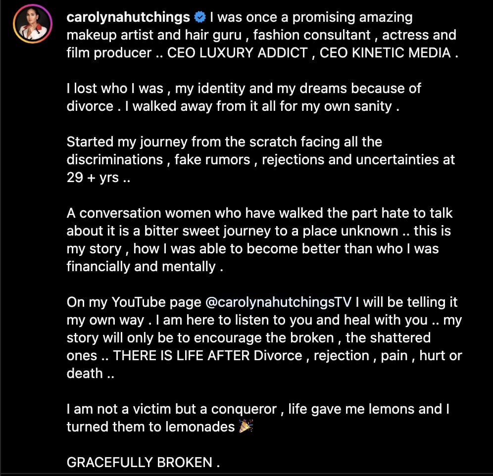 Scottish-Nigerian actress Carolyna Hutchings recounts the experience of losing everything following her divorce from her ex-husband, Musa Danjuma.