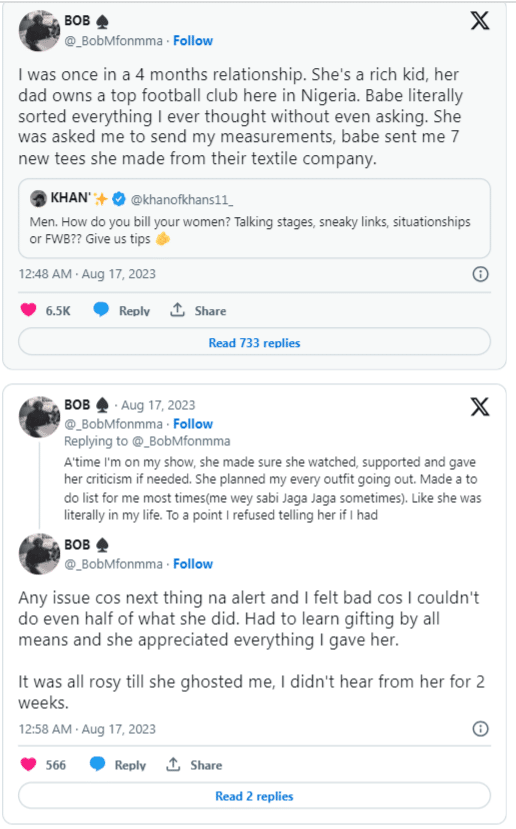 “I was once in a 4 months relationship. She’s a rich kid, her dad owns a top football club here in Nigeria. Babe literally sorted everything I ever thought without even asking. She was asked me to send my measurements, babe sent me 7 new tees she made from their textile company.